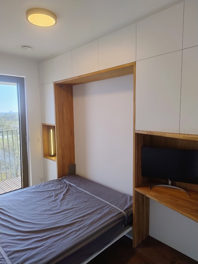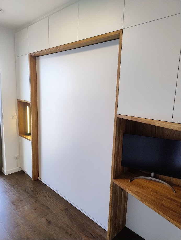 Wandmeubel met groot dubbeld bed in verwerkt.